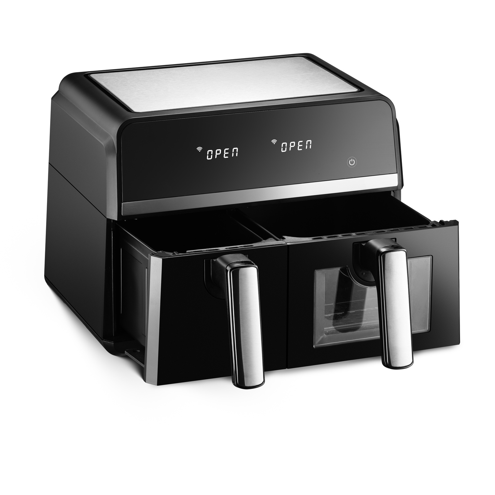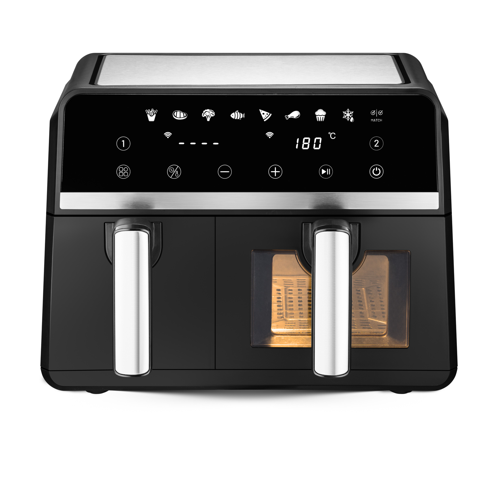 Frytkownica beztłuszczowa Mozano DuoFry Unlimited z dwoma niezależnymi koszami (3,5 l i 5,5 l – łącznie aż 9 l) pozwala przygotować różne potrawy jednocześnie, zachowując ich naturalny smak i wartości odżywcze. Dzięki technologii cyrkulacji powietrza 360°C dania są chrupiące na zewnątrz i soczyste w środku, przy minimalnym użyciu tłuszczu.