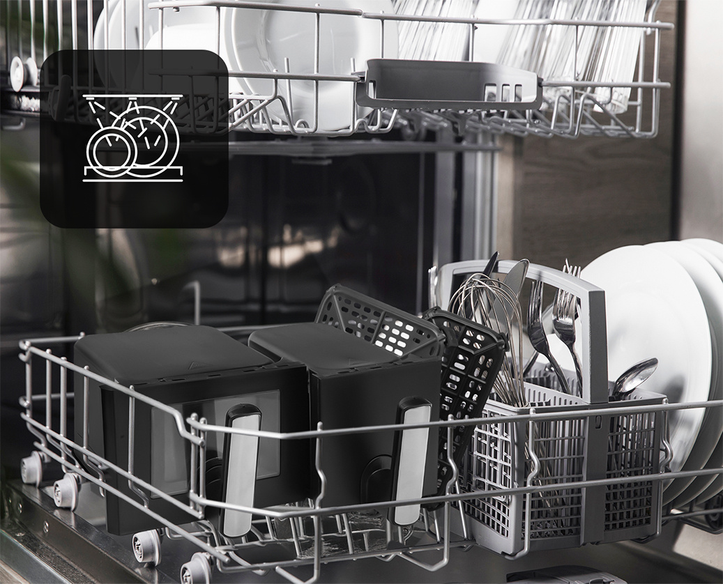 Funkcja SYNC - Idealne rozwiązanie, gdy chcesz przygotować dwa różne dania w tym samym czasie. Frytkownica automatycznie dopasuje czas pracy tak, aby obie potrawy były gotowe jednocześnie. Program z dłuższym czasem pieczenia uruchomi się od razu, a drugi kosz rozpocznie pracę we właściwym momencie. Dzięki temu wszystko będzie gotowe do podania w tej samej chwili!