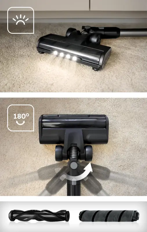 Głowna szczotka posiada mechanizm skrętny do 180° ułatwiający dotarcie do wszelki zakamarków.