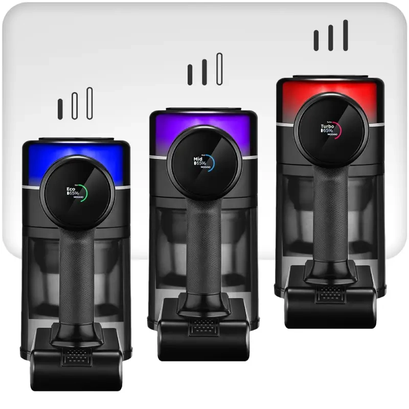 Odkurzacz Mozano Handy Pro 600 posiada, aż trzy tryby pracy (ECO, MID, TURBO), dostosowujące się do różnych potrzeb sprzątania.