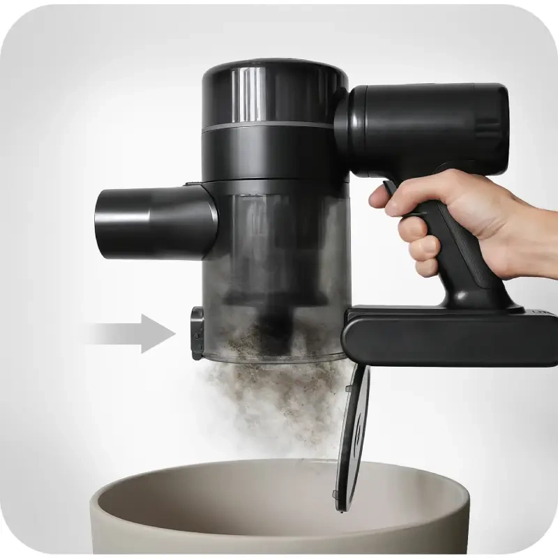Odkurzacz posiada łatwo dostępny pojemnik na kurz, który można szybko opróżnić bez kontaktu z brudem. Zdejmowane i myjące się filtry oraz szczoteczkę do czyszczenia pozwalającą na utrzymanie urządzenia w czystości, co zapewnia jego długotrwałą i efektywną pracę. Dzięki temu konserwacja odkurzacza jest prosta i szybka, co oszczędza czas i wysiłek użytkownika.
