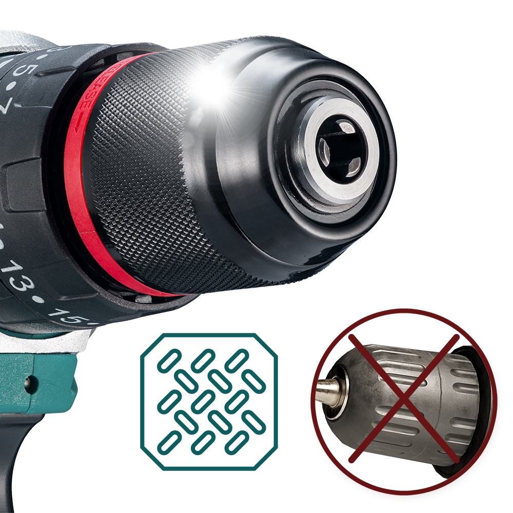 - Metalowa głowica (uchwyt wiertarski): znacznie trwalsza niż plastikowe odpowiedniki, odporna na zużycie.