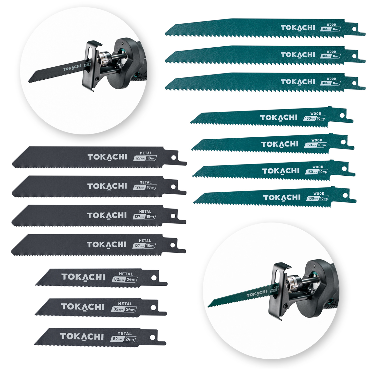 Profesjonalny zestaw aż 14 brzeszczotów do piły szablastej Tokachi Kitsune 300: do drewna i do metalu, w dwóch długościach, w dwóch kolorach, bez zgadywania który jest do czego.